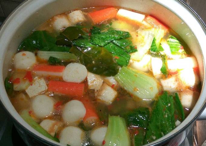 Setelah mendidih masukkan bakso olahan ikan masak hingga bakso matang kira2 2 menitan. Suki tomyam steamboat sederhana dengan bumbu kearifan lokal Baso ikan steamboat Sawi putih Jamur enoki sawi packcoy Sosis Daging slice beef secukupnya Daun bawang secukupnya saya pake 1 Bumbu halus. Cekidot resep dan cara memasaknya berikut ini.